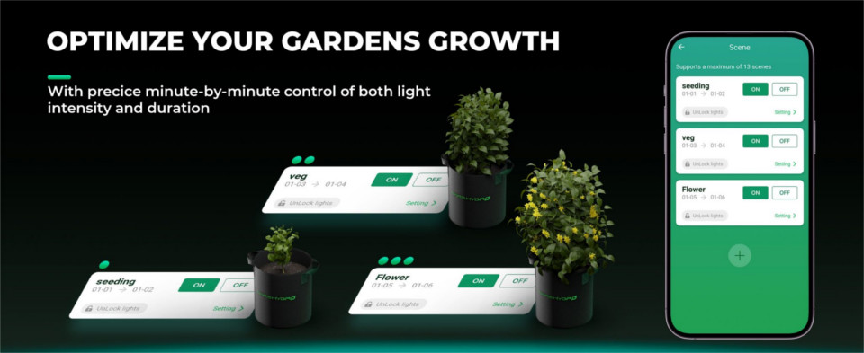 Z aplikacijo MarsHydro app. FC 6500 uporabnikom omogoča nastavitev posebnih svetlobnih ciklov za svoje rastline. Ta funkcija avtomatizira postopek vklopa in izklopa luči v natančnih intervalih ter simulira naravne dnevne in nočne cikle. Pomaga urejati urnike svetlobe brez ročnega posega.