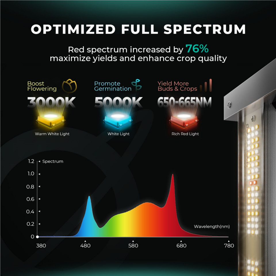 Mars Hydro Smart FC 6500 EVO svetilka je zasnovana za najvišje donose in največjo učinkovitost. FC6500 uporablja enakomerno porazdelitev fotonov, da doseže enakomeren PPID in vrhunski PPF po celotni rastlinski krošnji.