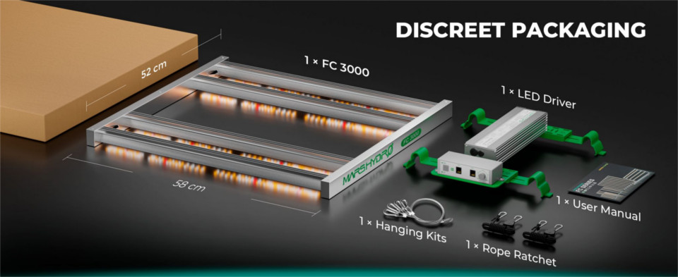 Mars Hydro Evo FC 3000 je namenjen za domačo uporabo kot je gojenje v šotorih. Skupaj s specializiranimi belimi spektri, ki so bogati z rdečimi in modrimi valovnimi pasovi, FC3000 uporablja enakomerno porazdelitev fotonov, da doseže enakomeren PPID in vrhunski PPF po celotni rastlinski krošnji.